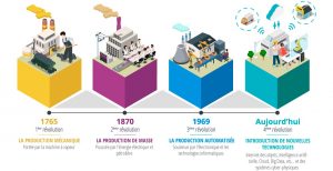 NDUSTRIE 4.0 : ORIGINE, DÉFINITION ET MISE EN OEUVRE Le terme industrie 4.0 est apparu la première fois en 2011 au Forum mondial de l’Industrie de Hanovre. Le projet “Industrie 4.0” ou “Industrie du futur” correspond à une nouvelle façon d’imaginer les moyens de production. Le 4, c’est pour marquer cette 4éme révolution industrielle. UNE NOUVELLE RÉVOLUTION INDUSTRIELLE EST EN MARCHE industrie 4.0 : les révolutions industrielles 1ERE RÉVOLUTION INDUSTRIELLE Elle remonte à l’exploitation du charbon et la mise au point de la machine à vapeur par James Watt en 1769. Cela va transformer radicalement le mode de fabrication. En effet, l’artisanat va être remplacé par la production mécanique, les usines vont se substituer aux manufactures et ateliers artisanaux… Dans les usines, la révolution correspond à l’utilisation de la machine à vapeur comme moteur pour actionner les machines permettant des cadences accrues. Ce qui entraîne une fabrication plus importante, et donne vie à des produits en petites séries. 2EME RÉVOLUTION INDUSTRIELLE La seconde est amenée par l’utilisation du pétrole et de l’électricité à la fin du XIXème siècle. Cela va permettre de moderniser les moyens de production. Les industries automobile et chimique vont en profiter pleinement. Dorénavant, les machines de production ne sont plus “à la vapeur” mais “électrique”. Cette époque correspond à la mise en place du taylorisme et du travail à la chaîne rendant productif les ouvriers non qualifiés. Nous parlons alors de production en masse de produits identiques. 3EME REVOLUTION INDUSTRIELLE Puis, une 3ème révolution a eu lieu au milieu du XXème siècle avec l’avènement de l’électronique, des télécommunications ou encore de l’informatique. Ces différentes disciplines vont permettre la mise en place d’automatisations importantes qui soulageront les ouvriers des tâches les plus difficiles. C’est le début de la robotique, de la flexibilité des outils de production et de la production en grandes séries. Par ailleurs, certains situent cette 3ème révolution un peu plus tard, au début du XXIème siècle. Elle serait basée sur la transition énergétique (énergies renouvelables, bâtiments producteurs d’énergie et capacités de stockage de l’énergie) ainsi que sur les technologies numériques. En effet, cela aurait donc marqué la fin de l’exploitation des énergies fossiles (charbon, pétrole, …) et l’avènement de l’énergie propre (soleil, air, eau). Enfin, l’une des caractéristiques importantes de cette troisième révolution est la notion de mobilité (des biens et des personnes). En résumé, il y a eu la machine à vapeur, la machine électrique, le robot industriel et maintenant … le système cyber-connecté. 4EME REVOLUTION INDUSTRIELLE Aujourd’hui, il n’est plus question qu’un moyen de production produise à la chaîne (ou plutôt reproduise) un produit des milliers de fois. Nous sommes entrés dans l’ère de la personnalisation des produits. Le consommateur veut un produit complètement personnalisé, qui ne ressemble pas à celui de son voisin. L’industrie 4.0 s’engage à répondre à cette exigence de produits uniques et personnalisés tout en conservant des coûts équivalents, et cela malgré les faibles volumes de production engendrés. C’est pourquoi l’un des défis de cette 4ème révolution industrielle est de réussir à connecter le besoin du client à l’organe de production. Cette connexion ne peut se faire sans l’apport des nouvelles technologies, qui devront être exploitées dans cette “nouvelle usine”…